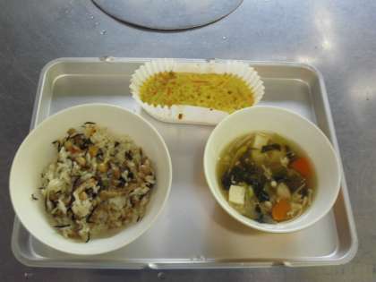 献立名 豆入りひじきごはん 牛乳 卵焼き 豆腐汁