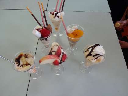 パフェを作りました。コーンフレークや果物やポッキーやアイスなどをおいしそうに飾りました。どのパフェもお店にあるようなパフェになりました。「わっ!すてき。おいしそう。」歓声があがりました。