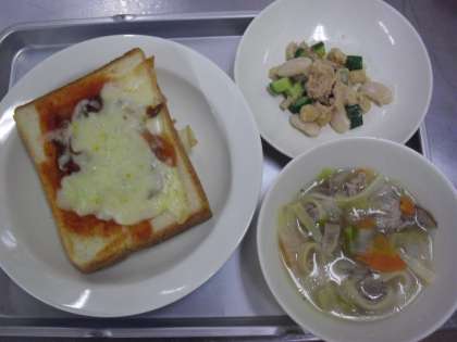献立名 ピザトースト 牛乳 ヌードルスープ ビーンズサラダ