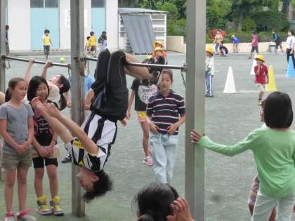 そして鉄棒では先生が離れ技のお手本を見せていました。