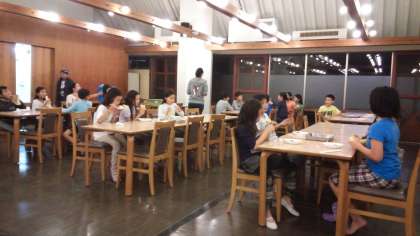 雨が降り出してきたため、ナイトハイクは中止です。お風呂あがりにバナナと自分たちで作ったこんにゃくを食べています。