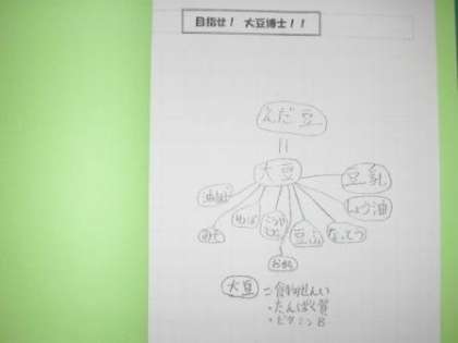 今日の1時間目の総合で大豆博士になろうという課題をやりました。ぼくは、大豆から何ができているのかあまり知らなかったけれど、みんなの意見を聞いて分かりました。よかったです。