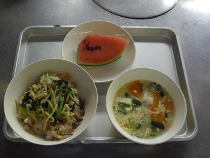 おもな食材の産地:米(秋田)、豚ひき肉(青森)、こまつな(埼玉)、もやし(栃木)、鶏もも肉(青森)、たまねぎ(香川)、にんじん(千葉)、豆腐(富山・滋賀)、鶏卵(群馬)、にら(茨城)、小玉スイカ(新潟)