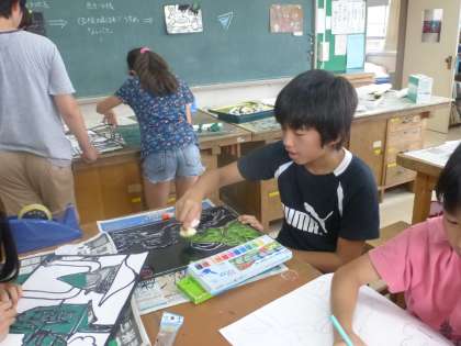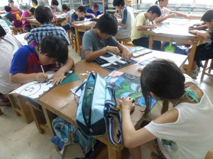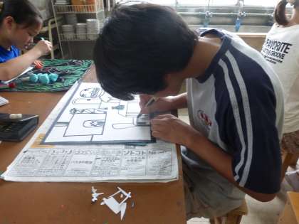 カッターを使って工作用紙を切り抜き、上手に着色していきます。