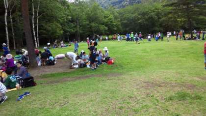 宿舎を出発し、お買い物をした後は、ハイキングをしました。日なたは暑いくらいですが、ハイキングのほとんどが日陰で、通り抜けていく風が心地よい天気です。野鳥公園の木陰でお弁当を食べています。