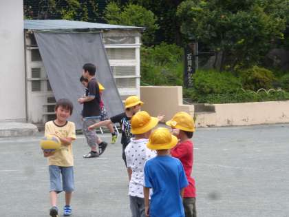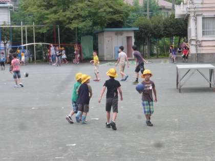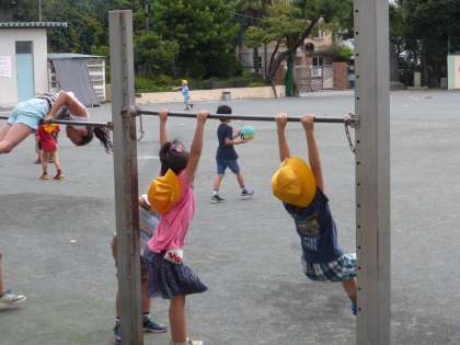 校庭に黄色い帽子をかぶった1年生が元気いっぱいに遊んでいました。