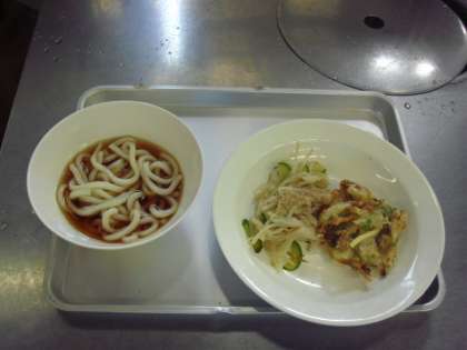 台風一過の暑い今日も気候にぴったりの献立です。冷たいうどんにサクサクのかきあげ、さっぱり味のごま酢かけでした。