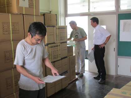 副校長先生と若林町会の方が校内にある防災倉庫で物品の点検をしています。