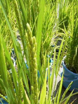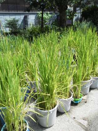 5年生のバケツ稲にたくさんの稲穂がついています。