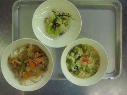 献立名:スタミナ丼、牛乳、キャベツの塩こんぶかけ、かきたま汁