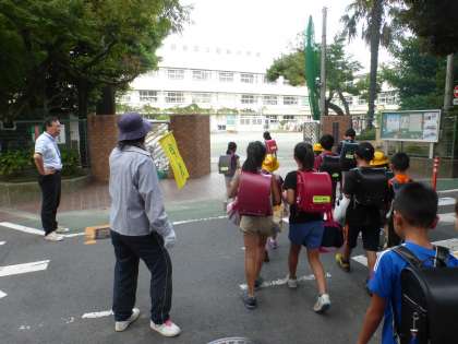 通学路安全確保のためにたくさんの先生が通学路に出ています。