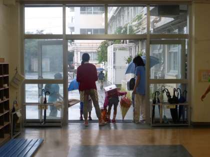 子どもたちがやってくると、玄関では先生たちが濡れたランドセルを拭いています。