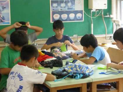 音楽バッグと体育袋の縫い目をみながら、つくり方を考えました。