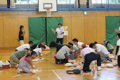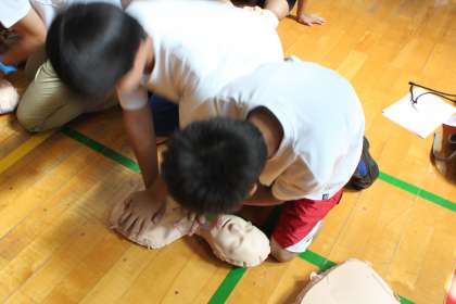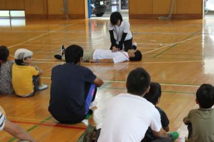 子どもたちも心臓マッサージは初めてのようで恐る恐るやってきました。