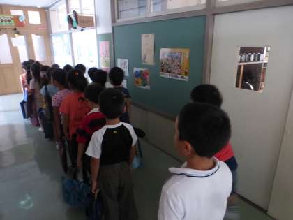 1年生が音楽の学習の後、教室に戻るために整列しています。