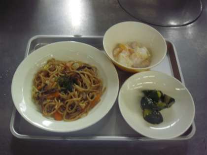 献立名:ソース焼きそば、牛乳、きゅうりの中華味、フルーツヨーグルト