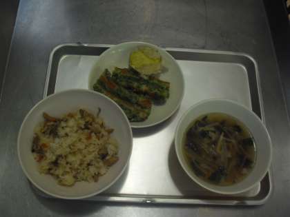おもな食材の産地:こめ(青森)、にんじん(北海道)、しめじ、(長野)まいたけ(長野)さやいんげん(群馬)、さつまいもたけい(茨城)、豚肉(埼玉)、たけのこ(九州)、ダイコン(北海道)、もやし(栃木)、こまつな、(九州)