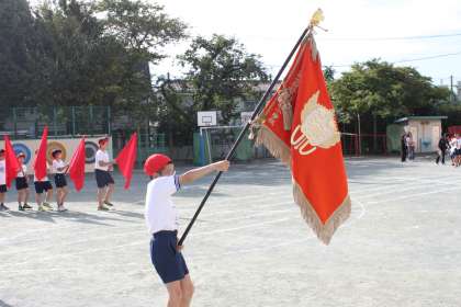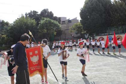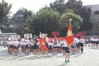 若小伝統の校旗に優勝旗を掲げて6年生が堂々の入場です。