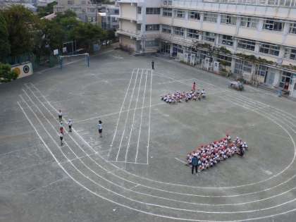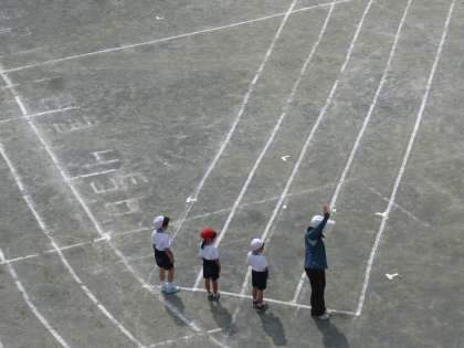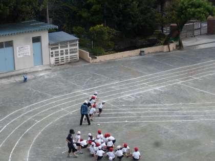 1年生と2年生が校庭で短距離走の練習をしていました。