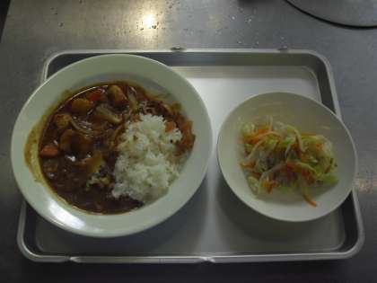 献立名:チキンカレーライス、牛乳、福神漬、野菜の甘酢かけ