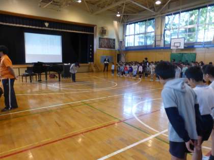 全校児童が体育館に集合し、ビリーブを熱唱しました。