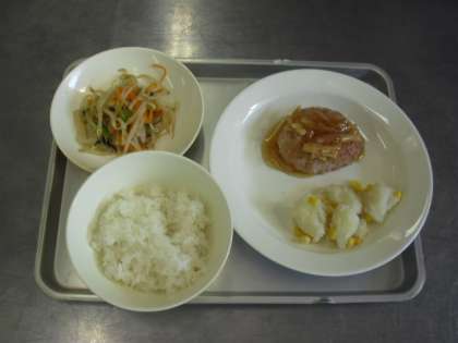 献立名:ごはん、牛乳、むろあじバーグ、おひたし、コーンポテト