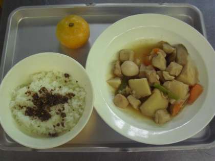 献立名:ごはん、牛乳、ふりかけ、鶏肉と里芋のうま煮、くだもの