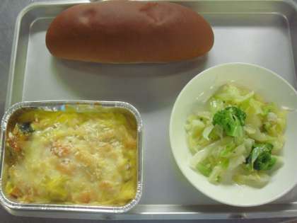 献立名:ココアパン、牛乳、マカロニグラタン、ブロッコリーサラダ