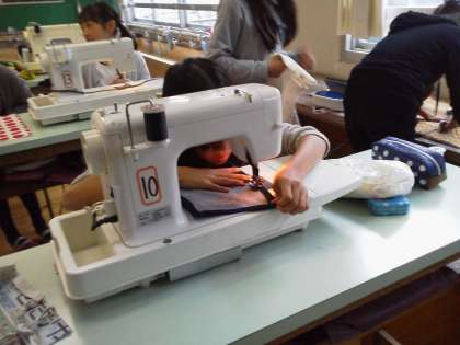 ミシンを上手に使って、袋制作に取り組んでいる6年生。