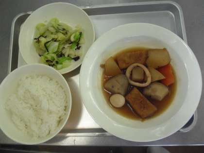 献立名:ごはん、牛乳、いかと大根のうま煮、キャベツの塩こんぶかけ
