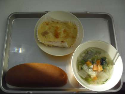 献立名:黒砂糖パン、牛乳、フレンチエッグ、白菜のスープ