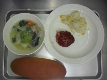 献立名:ミルクパン、牛乳、アップルチーズハンバーグ、コーンポテト、ベーコンと野菜のスープ