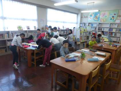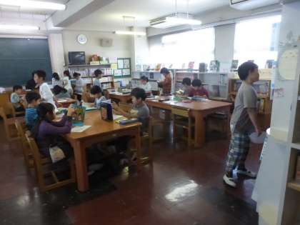 ある時間の図書室は2クラスが入り混じっての大読書大会!