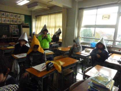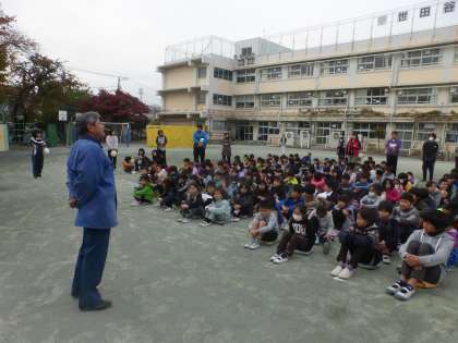 細い通路を通って、どの学年の子たちも校庭に避難しました。