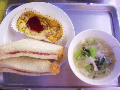 献立名:ジャムサンド、牛乳、スペイン風オムレツ、白菜のスープ