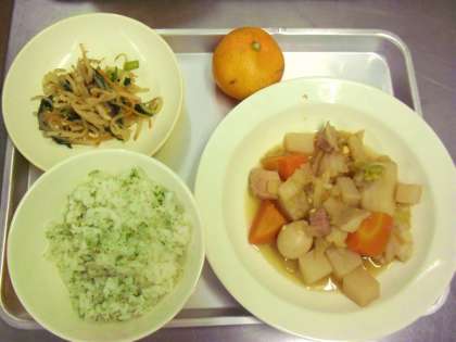 献立名:じゃこと青のりのごはん、牛乳、豚肉と大根のうま煮、きのこのおひたし、くだもの