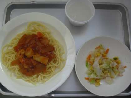 献立名:スパゲッティ地中海ソース、牛乳、コーンサラダ、ホワイトゼリー