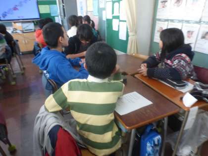 6年生が外国語活動の時間に英語劇の構成について相談しました。