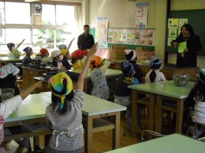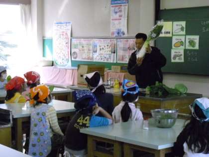 授業には、中央卸売市場食育応援隊の西澤さん(八百屋さんの店長さんです。)をゲストティーチャーとして招き、旬の野菜のお話や食べ物に感謝して食べる大切さについてお話していただきました。
