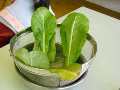 自分たちが育てた小松菜から、旬の野菜のことや、食物への感謝の気持ちをもつ大切さについて考えました。