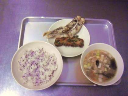 おもな食材の産地:米(青森)、ししゃも(ノルウェー)、鶏卵(群馬)、にんじん(千葉)、じゃがいも(北海道)、油揚げ(大豆)(カナダ)、ねぎ(千葉)、生わかめ(徳島)