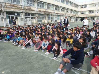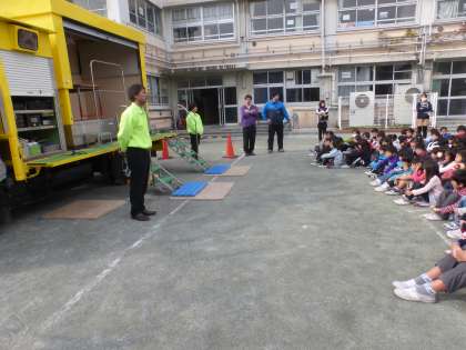 代表児童と代表の先生によるデモンストレーションをみんなで見学しましたが、震度7の揺れの大きさに1年生はビックリしていました。
