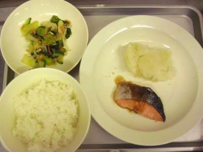 献立名:ごはん、牛乳、魚のステーキソース、粉ふきいも、和風サラダ