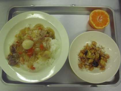 献立名 中華丼 牛乳 大豆とさつまいもの甘辛揚げ 果物