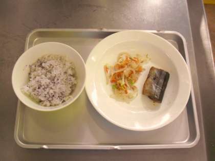 献立名:ゆかりごはん、牛乳、さんまの松前煮、野菜のごまだれかけ