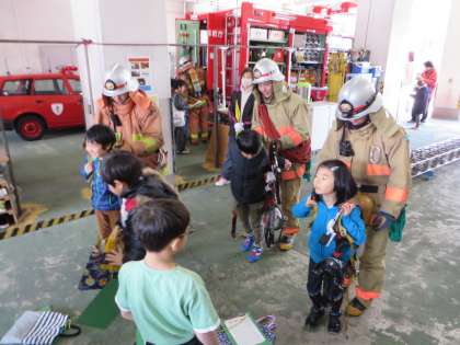 消防士さんの身につけている道具をお借りして、着装体験もしました。
