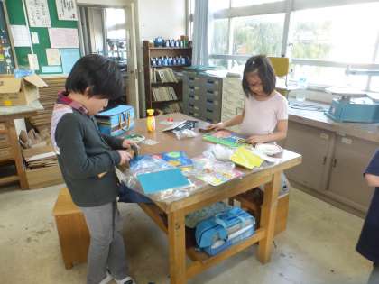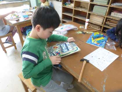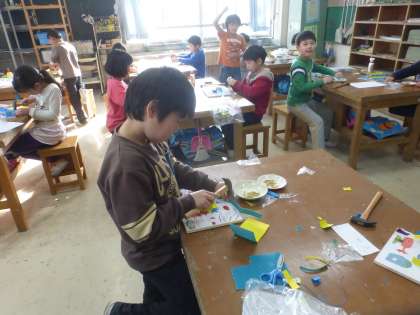 3年生が図工の時間に木の板とくぎを使った制作をしていました。