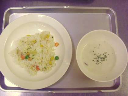 献立名:三色ピラフ、牛乳、ポテトスープ