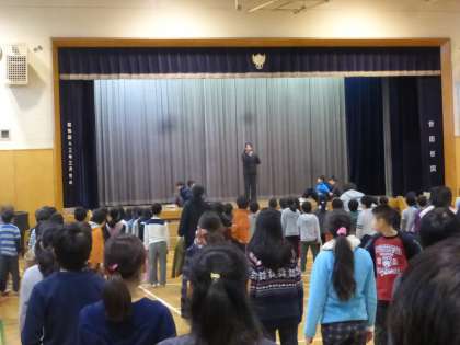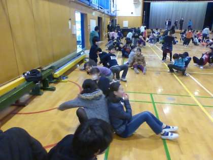 今日は運動朝会で、室内でできる簡単な運動を紹介してもらいました。