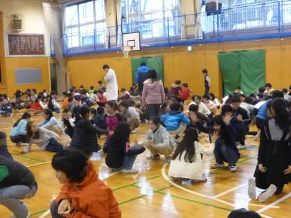 運動委員さんのお手本を観て、近くの友達と一緒にやってみます。